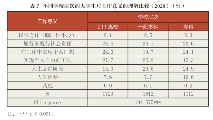 比较不同学校层次的大学生对工作意义的理解可以发现,211高校的大学生最看重工作作为“实现个人自由的工具”(27.7%),其次是“在工作中实现个人理想”(24.0%);一般本科的大学生最看重工作作为“实现个人自由的工具”(25.2%),其次是“履行家庭与社会责任”(24.1%);专科学校的大学生最看重工作作为“人生必经阶段”(24.9%),其次是“在工作中实现个人理想”(24.1%)。由此可见,211高校的大学生最看重工作的精神价值;一般本科的大学生除了注重工作的精神价值之外,也注重履行家庭与社会责任;专科学校的大学生首先将工作作为生存的手段,其次才是追求工作的精神价值。