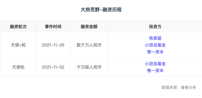 资料显示,大热荒野成立于2020年底,走的是精致露营Glamping的路线。2021年11月,大热荒野连续获得两轮超千万元人民币融资,由小恐龙基金、惟一资本、牧高笛等投资机构及公司联合投资,资金主要用于营地扩展、市场运营和户外装备用品业务线尝试等。