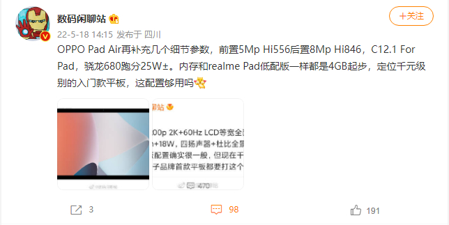 今天该博主又曝光了更多配置信息,称该平板前置 500 万像素 Hi556 传感器,后置 800 万像素 Hi846 传感器,搭载 ColorOS 12.1 for Pad 操作系统,骁龙 680 跑分 25W±。内存和 realme Pad 低配版一样都是 4GB 起步,是一款定位千元级别的入门款平板。