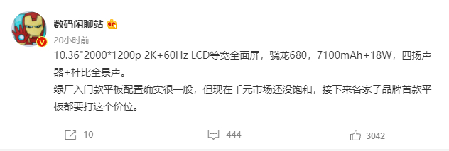 IT之家了解到,此前博主 @数码闲聊站 曝光了这款平板电脑的一些配置,称该平板定位千元机,将搭载骁龙 680 处理器,配备了一块 10.36 英寸、分辨率为 2000×1200p、刷新率为 60Hz 的 LCD 等宽全面屏,电池容量为 7100mAh,充电功率为 18W,辅以四扬声器且支持杜比全景声。