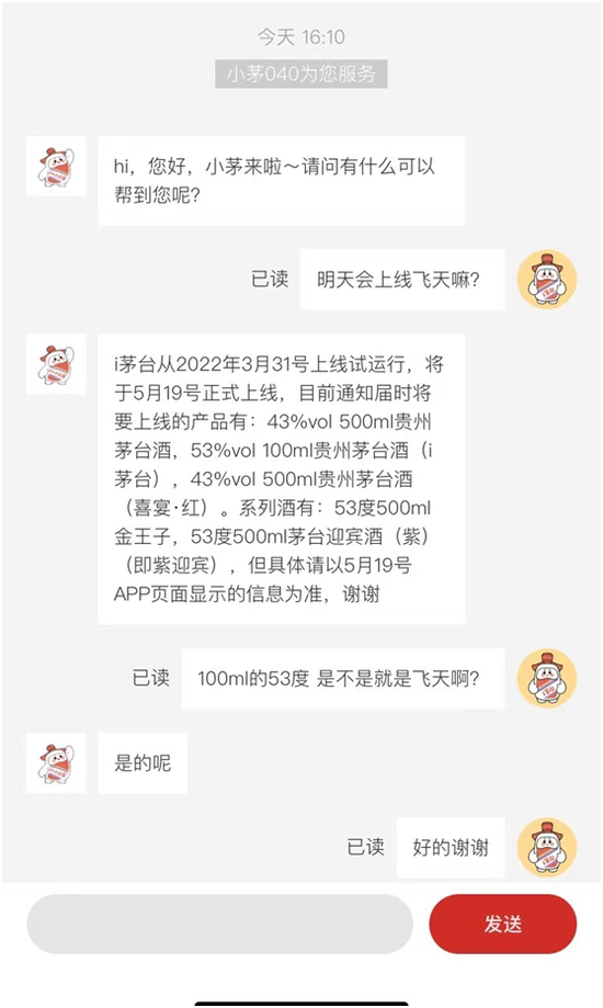 当记者询问100ml的飞天是否只能在“i茅台”购买时,客服表示并未接到相关通知,建议咨询线下门店。
