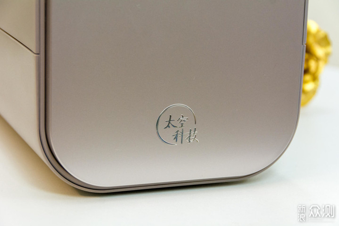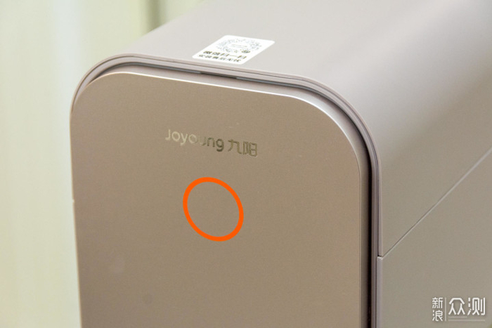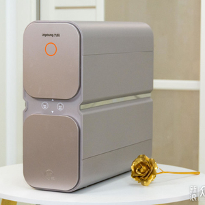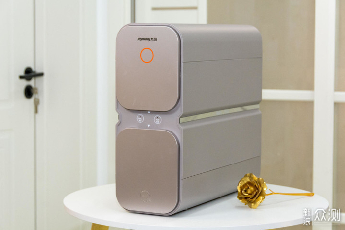 打开包装膜就看到了九阳双出水净水机,香槟金色的主机如同一个小的电脑机箱,外形尺寸:426mmx155mmx391mm,重量约9.7kg。前面有2个盖,上面的印有LOGO,中间的指示灯是ROC复位和PCP复位,下面的印有太空科技。机身有一条银色腰线,标注有800G Plus的字样。整机看上去是很有科技感的。