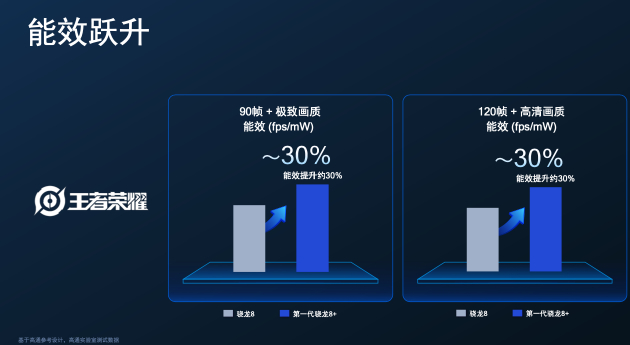在《王者荣耀》测试中,“90帧+极致画质”和“120帧+高清画质”两组测试场景中,骁龙8+对比骁龙8均有30%左右的能效提升。