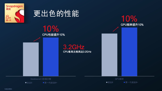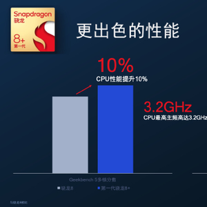 第一代骁龙8+是去年底发布的骁龙8的升级款,主要提升在制程工艺、CPU、GPU性能,同时在功耗上也有提升。