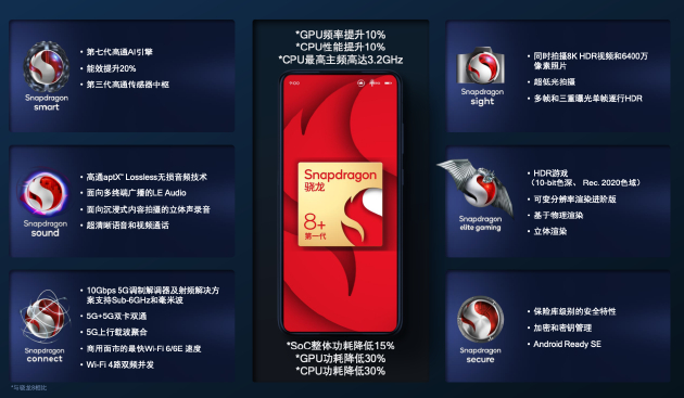 其他方面,骁龙8+支持第七代高通AI引擎,相比骁龙8能效提升20%;音频方面支持Snapdragon sound特性,支持高通aptX Lossless无损音频技术、立体声录音、超清晰语音和视频通话;连接方面支持最高10Gbps的5G调制解调器及射频解决方案,支持Sub-6GHz与毫米波,支持5G+5G双卡双通、5G上行载波聚合、Wi-Fi 6/6E以及Wi-Fi 4路双频并发;拍摄方面,支持同时拍摄8KHDR视频与6400万像素照片、超低光拍摄、单帧逐行HDR等特性;游戏方面不仅是性能、功耗表现升级,Snapdragon Elite Gaming支持HDR游戏、可变分辨率渲染进阶版(VRS Pro)、立体渲染和物理渲染特性;在安全性方面,骁龙8+同样支持Android Ready SE认证,可提供保险库级别的安全特性。
