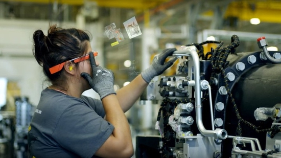 ▲明尼苏达州的一名工厂工人在装配线上使用 Google Glass EE,图片来自:MPRnews