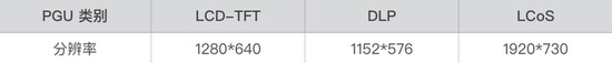 首先是分辨率,这个好理解。与手机、电脑的屏幕一样,分辨率越高,显示效果则越细腻。抬头显示的分辨率通常与光机类型有关,常见的光机类型有 3 种:TFT-LCD、DLP,和 LCoS。