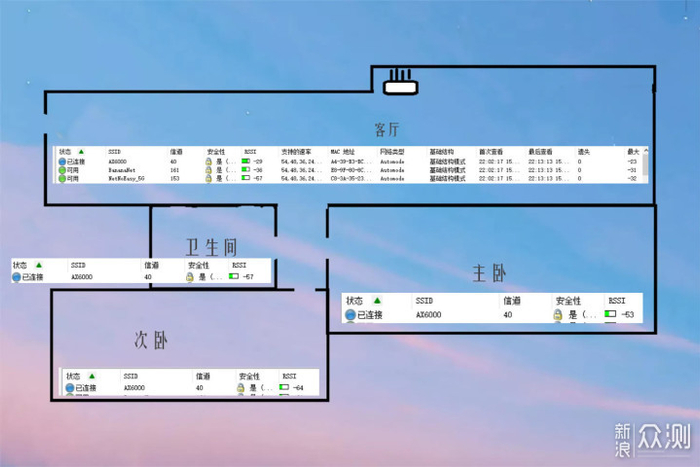 路由器放在客厅的位置,通过“WirelessMon Prefesssional”软件测试WiFi信号如下,客厅位置-29,主卧-53,卫生间-57,次卧为-64,随着穿墙层级越多信号逐渐衰弱,不过整体信号强度还是很不错的。