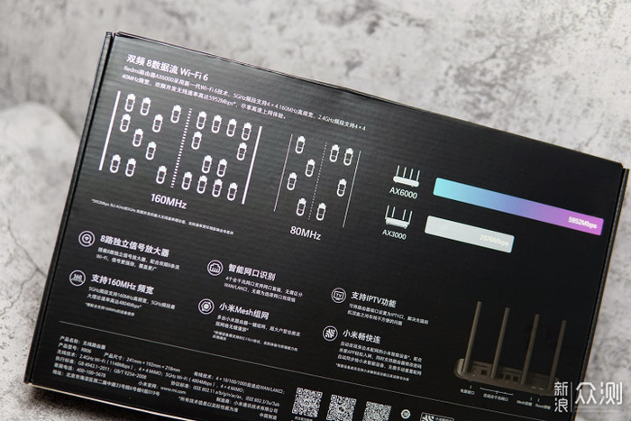 背部是一些产品特性,比如8路独立信号放大器、智能网口识别,支持IPTV功能以及小米Mesh组网等功能,从对比图看来AX6000相比AX3000整体性能提升也非常的明显。