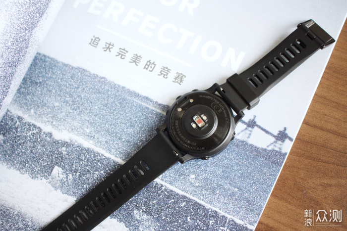 背面正中是一颗飞利浦光学心率传感器,左侧是两颗充电器触点。