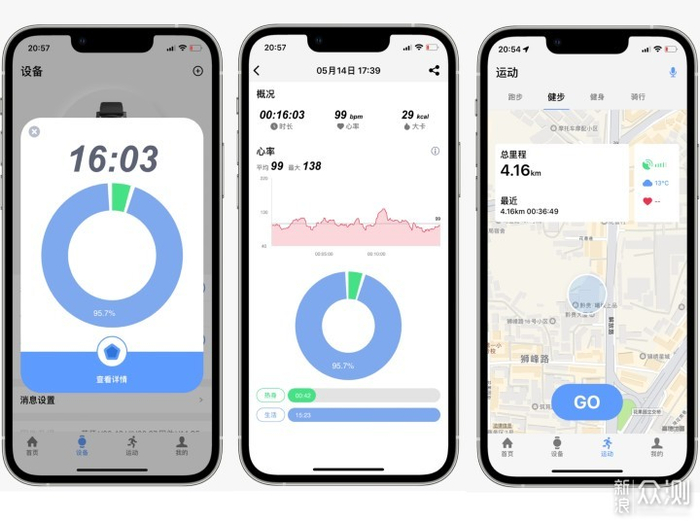 首页:一目了然查看当日运动情况和近期运动记录,除此外,还集合了监测心率、体力值、最大摄氧量、乳酸阈值和马拉松成绩预估等信息窗口,通过卡片设置可以增减信息窗口数量。设备:显示绑定设备信息,设置手表部分功能,包括来电提醒、久坐提醒、发送天气/AGPS、消息设置等等,能够自由切换宜准其他产品。运动:显示运动信息,主要包括7种跑步模式、健步、室内运动和骑行。我的:集合了个人运动勋章、运动报告、每日目标设置、语音播报等内容。