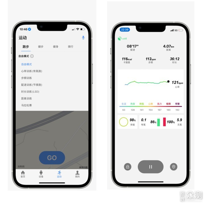 官方APP名为“宜准跑步”。如图,当腕表已连接APP时,宜准R6支持7种跑步方式,不同跑步方式可自由设置对应训练参数,比如心率范围、步频幅度、配速区间等等,跑步过程中会实时提醒跟踪,每次跑步训练结束都会生成数据全面的分析报告,包括用不同颜色代表不同心率强度的心率曲线、体能、有氧无氧运动情况等。