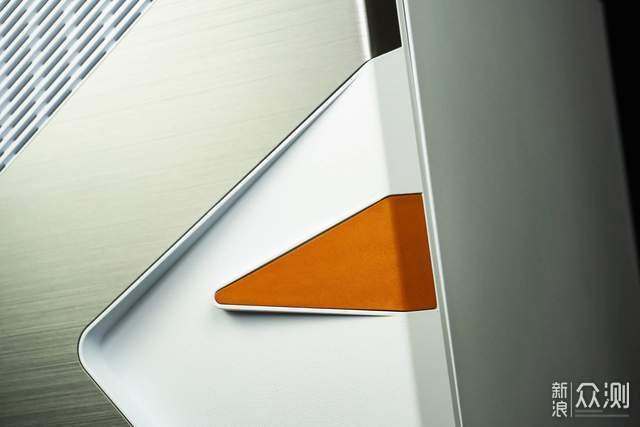 区域特写给到这块特显眼的橙色三角部分。机箱面板普遍采用金属、塑料设计,这一块采用皮质设计就非常耐人寻味。这块SSS级小牛皮尽显档次,搭配周边的金属拉丝面板,整体倒是动静结合,体现出静谧与灵动。