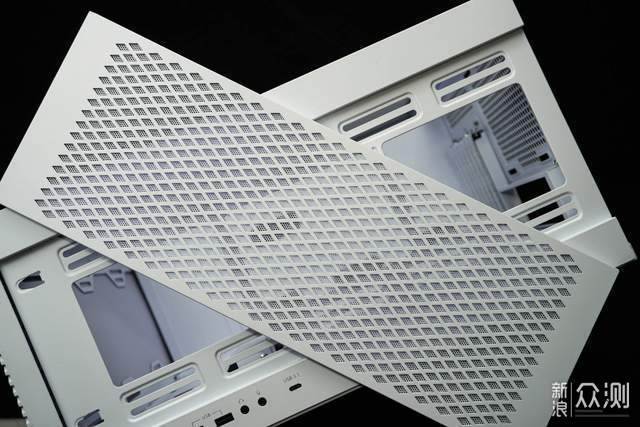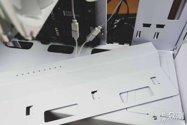 前面板内侧下方有个可拆装的小盖板,如果装360水冷或者风扇的话可以拆下;平时则可以不处理以维持内部规整布局的视觉表现。