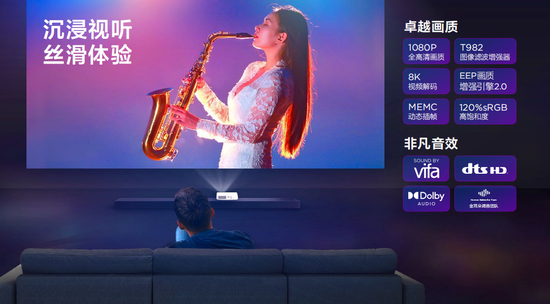 小新520智能投影仪不仅颜值优越,实力同样不凡。画质上,支持8K解码,120%sRGB广色域及独创EEP画质引擎2.0,保证时刻投出高清画质。音频上,小新520智能投影仪与丹麦Vifa音响品牌深度合作,同时还通过了杜比音效和DTS双认证,以及DSP动态声学算法加持,精准还原每一个音阶。再搭配上两支5W的全频立体扬声器和300CC的大体积音腔,带来高保真体验。