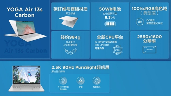“轻盈本”YOGA Air 13s Carbon机身采用碳纤维和铝镁等高端材质,轻约984克,十分小巧。搭载最新第十二代酷睿处理器,配备2.5K 90Hz PURESIGHT超感屏,续航长达8.3小时。