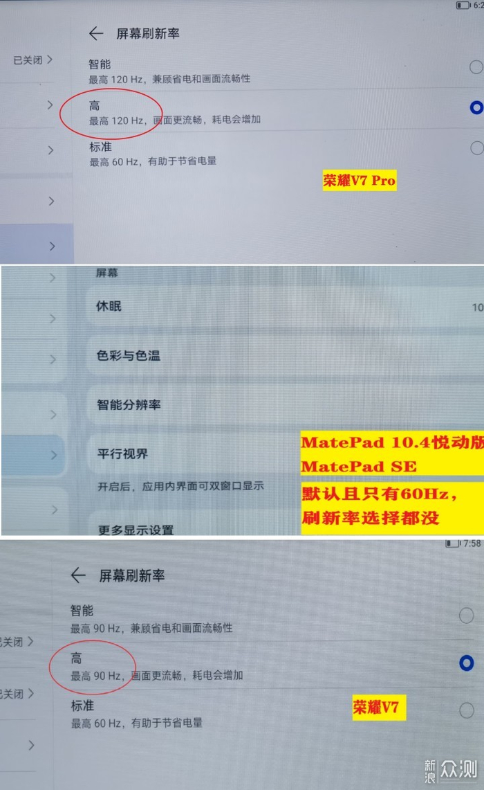 MatePad11和V7 Pro是120Hz,V7也是90Hz,但是悦动竟然和教育版、MatePad SE一样是60Hz,这就不能忍了!最坑的是,网上很多评测悦动为90Hz,完全是误导。没有对比就没有伤害(第2遍)!把120Hz、90Hz、60Hz放到一起滑动对比,正常人能明显感受到丝滑程度的不同。当你刷过了120Hz,你就再也回不到60Hz了!用60Hz刷剧也会感觉画面卡,虽说是个入门级Pad,但60Hz刷剧卡如何忍受?