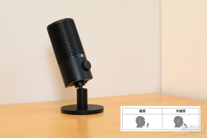 ▲这个麦克风主要是摆在桌面上使用,需要注意的是不能让麦头竖向对着嘴巴,正确的姿势是麦头的正面(LOGO面)对着嘴巴。