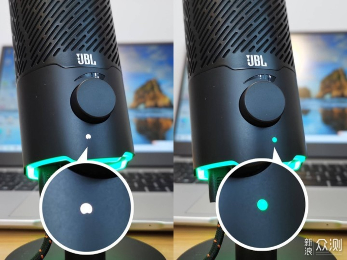 JBL Quantum Stream的麦头里面有两个14mm驻极体电容拾音头:1个心形拾音头和1个全方向拾音头,因此它有2种收音模式:心形(扇形)收音、全方向收音。长按旋钮2秒钟就可以切换收音模式(仔细看指示灯):