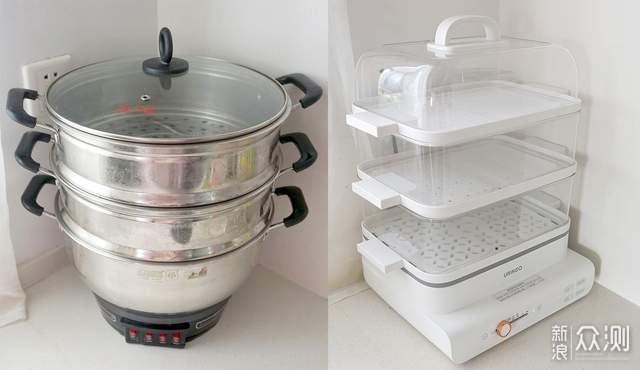 我家最早用的是左边那种传统圆形不锈钢蒸锅,一是没有预约功能,二是四周没做防水蒸气滴落设计,三是锅盖高度不够高,顶层热个稍微高点的食物就盖不住了,四是底层和中层完全看不到食物状态,蒸过头了也不知道。