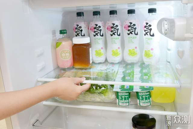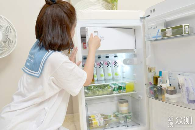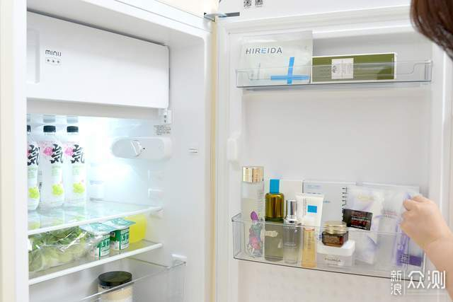 冰箱门可130度开合,取放物品都比较方便,我平时主要用它储存雪糕、护肤品以及爱喝的饮品、新鲜水果。