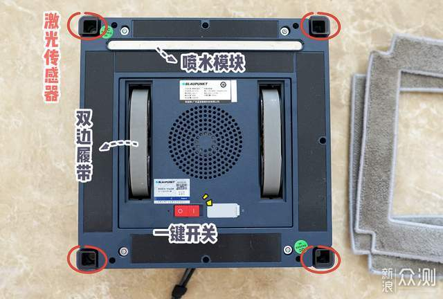 咱们细看下它的背面构造,首先四个边角都配有激光传感器,比传统擦窗机用物理滚轮探边高级多了。激光传感器可以精确探测玻璃边界,做到提前减速,所以无边框玻璃也可以放心交给它。