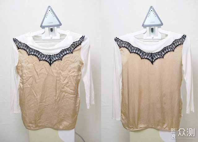 熨烫丝绸材质的上衣,都不用贴到衣服上,光靠增压蒸汽就给褶皱抚平了!这是我以往用那些小型手持的挂烫机,所没有过的体验。