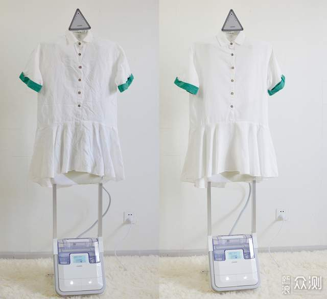 看下对比,是不是很夸张?!整个过程毫无水珠产生,熨完直接就能穿。这也是增压挂烫机的一大好处,强劲蒸汽射流,喷气不喷水,高温高压干蒸汽还能杀菌除螨去味。