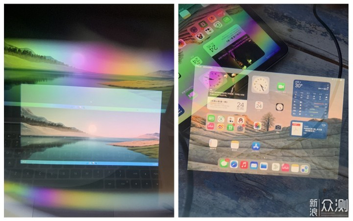 从Rokid Air的商品介绍页面中可以看出,它可以投影出的视场角为43°的120寸显示画面,实际体验中,Rokid的透视屏幕属性,让它在观影时背景画面的纯净度要求非常高,上图分别是连接笔记本和iPad的实拍画面,由于设备本身的透视镜片导致环境亮度对画面有很大的干扰,投屏使用效果并不好,如果作为扩展屏幕使用也许可以忽略这个缺陷吧。此外,如果是在夜晚或者拉上窗帘等纯黑的场景下使用体验会有不小的效果提升。