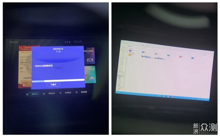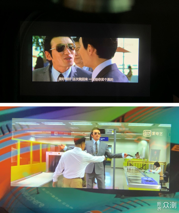 上图为纯黑的背景和对着电脑屏幕观影时的实拍画面,在暗处观影时,Rokid Air的这两块1080p微型屏的显示效果表现还是非常出色的,如果背景光线过强,观看体验非常像不拉窗帘看投影的感觉,不管是颜色表现还是亮度都有不小的影响。