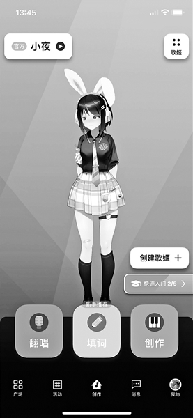 “歌叽歌叽”早在2021年年末就上线“虚拟歌手”制作功能。北京青年报记者试用了这款App:进入软件首页是像短视频平台一样的上下滑动页面,每页都有一个正在唱歌的虚拟歌手,目前男女分别各有两种形象,无法自定义。如果想要听到更多其他人生成的AI歌手的音乐,下滑即可刷新。