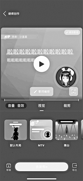 “硬核原创”的功能也较为简单,系统提供可供选择的音符,只需要随意选择就能完成一曲简单的旋律,歌词可以自己填,默认歌词为“啦啦啦”。完成自己的创作后,可以选择人声进行试听。
