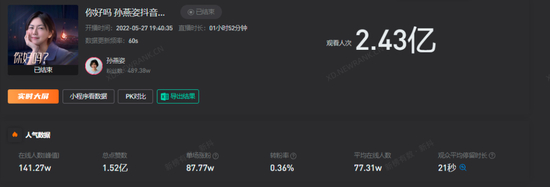 孙燕姿的线上“唱聊会”同样吸引了不少人的目光。直播间中刚出现她的身影时,观看人次就突破了3000万,1个小时后,唱聊会结束时,数据飙升到可怕的2.43亿次。另据新抖数据显示,孙燕姿通过这场直播单场涨粉87.77万,而其最新粉丝数已达651.1万。