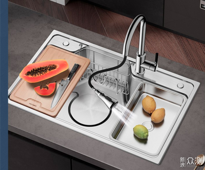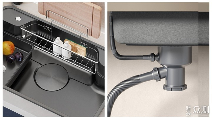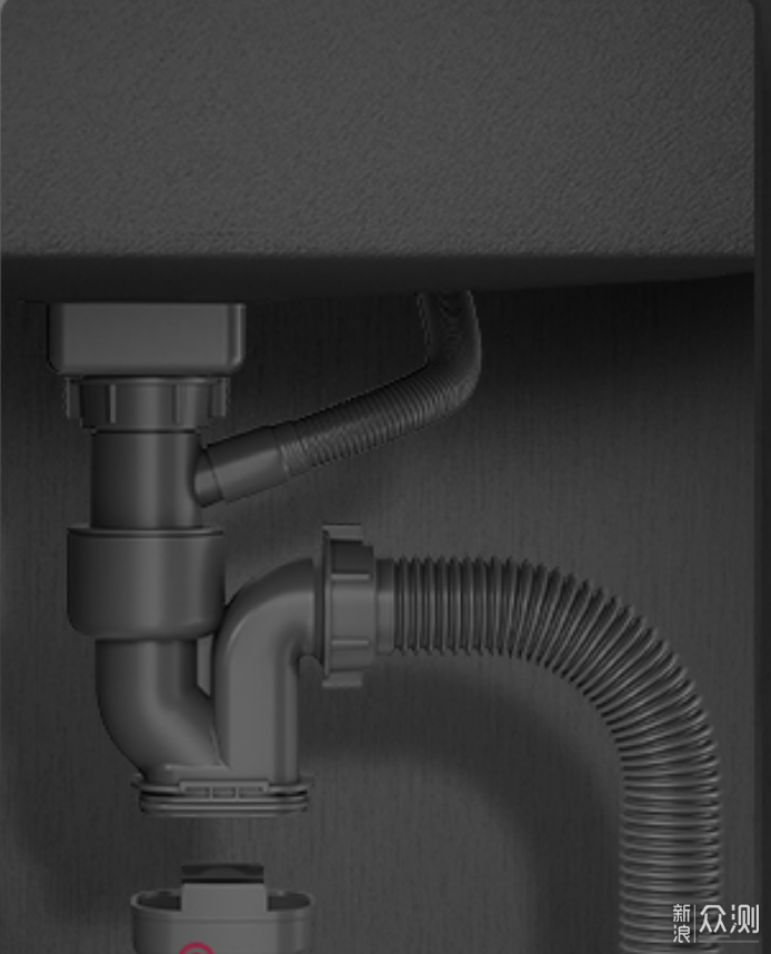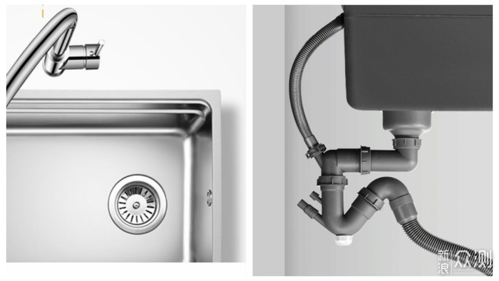 新型水槽的下水,口径上大了很多,而且底部的下水部件也做了优化,上图采用的应该是双通道型下水。