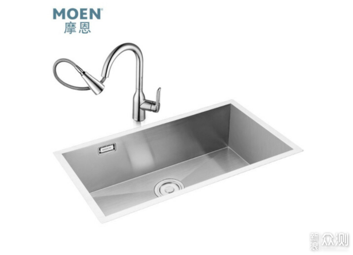 摩恩的价格不便宜,但是页面照片拍得真的是烂,这个手工大单槽长度750,宽度430,有下水后置设计,能节省一点台下的空间,没有涂层,没有附件,带龙头的价格2559,喜欢这个品牌的可以看看。