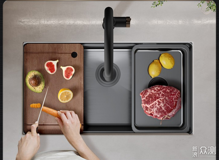 盆中盘与案板,很方便在洗菜、切菜的操作中在同一位置完成,而且盆中盆可以放置洗干净的肉与食材,方便马上切配。整体的好处一是在一个位置可以完成洗切配的工作,二是可以更好的节省厨房空间。