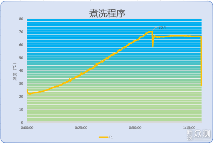 所以这里使用热电偶式温度计测试了一下上筒的高温煮洗程序的温度曲线。