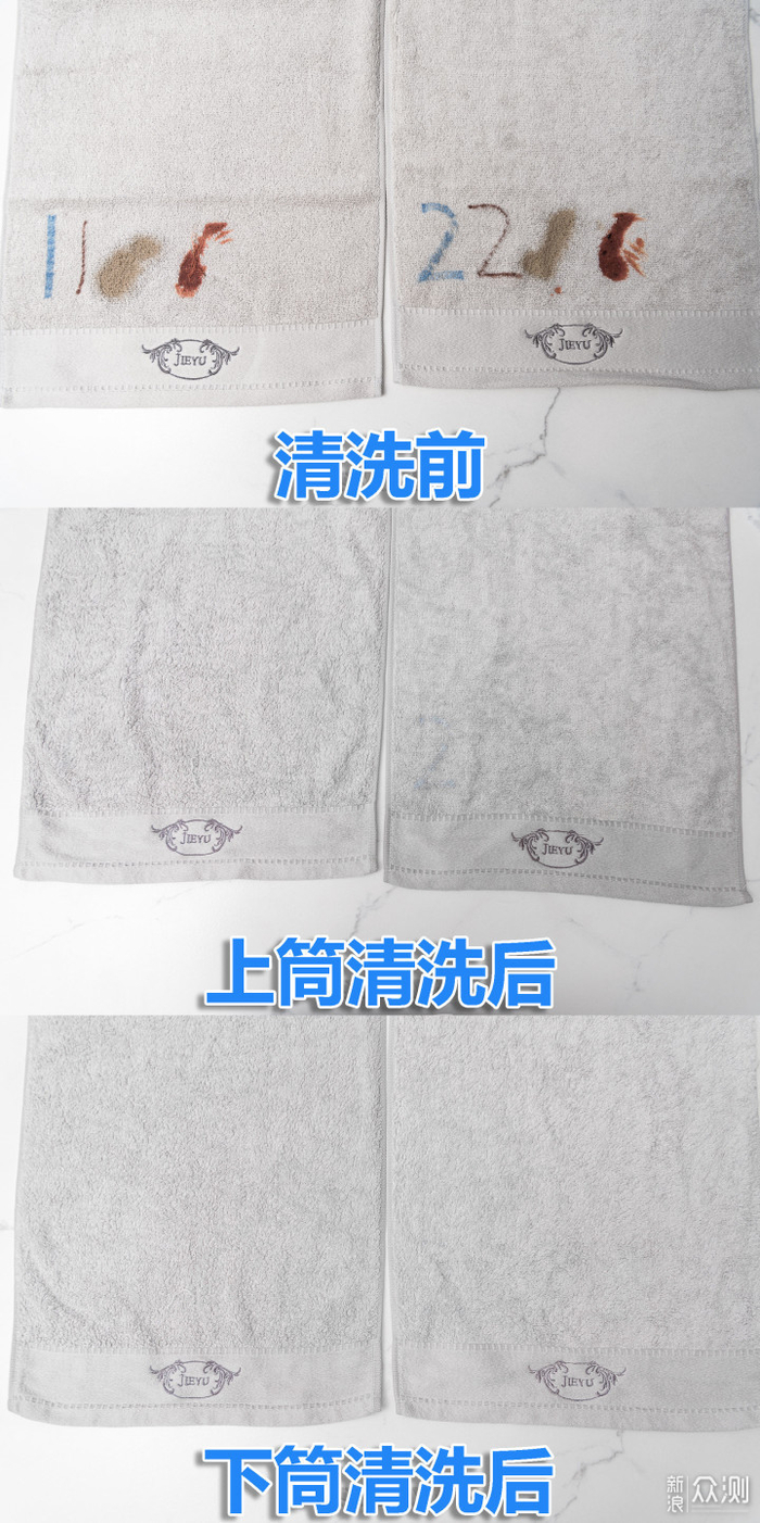 同样用上面测试过的毛巾来对比一下清洁能力,因为有残留污渍,所以不再重新添加污渍,继续清洗第二次,可以同时对比出上筒和下筒的清洗力度差异。