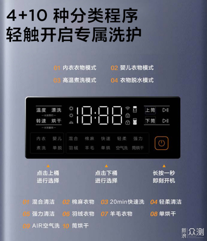 下筒程序:混合、棉麻、快速、轻柔、强力、单脱、羽绒、羊毛、单烘、空气洗、筒烘干。