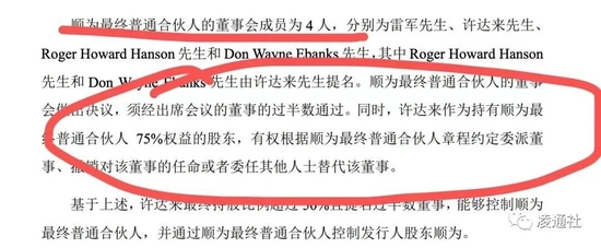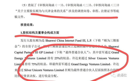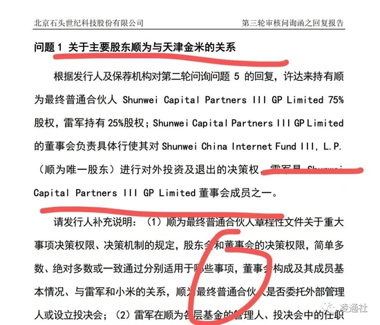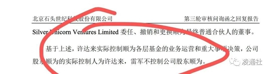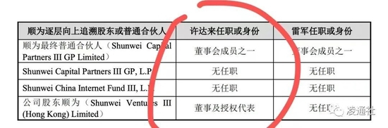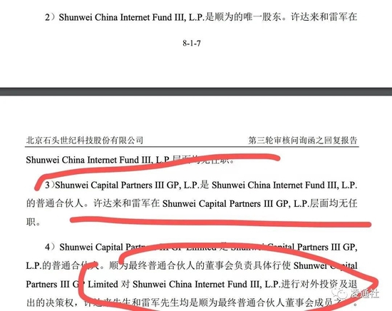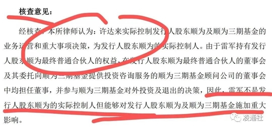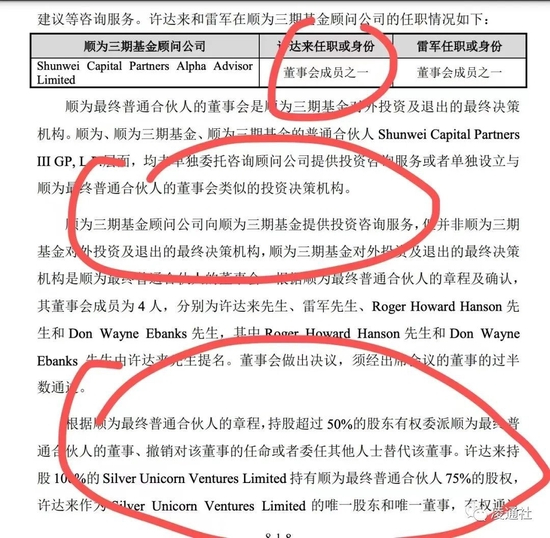 在IPO问询中,保荐人根据顺为提供的资料认定发行人股东顺为是 Shunwei China Internet Fund III, L.P。(“顺为三期基 金”)的全资子公司。而顺为三期又是雷军在英属维尔京群岛公司的公司占25%,许达来在英属维尔京群岛公司的公司占75%股份。而且,雷军成立了一家顾问公司为顺为三期推荐咨询公司,但也没有决策权。决策权在许达来。