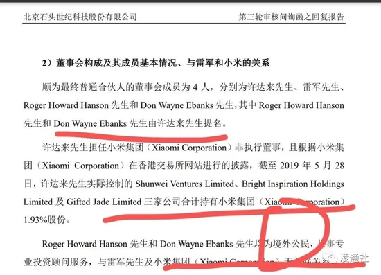 问询的精髓核心在于,雷军在境内设置顺为资本(简称境内顺为),公司董事许达来在境外设置顺为资本(简称境外顺为),这样是不是造成利益输送,而且许达来是不是为雷军代持股份呢。其实这也是现在雷军在石头项目中的显示问题。