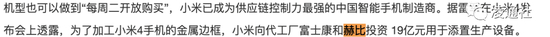 当时,小米也没有在香港上市,雷军控制的天津金米和上海赫比作为一家内资一家外资公司入股,从投资来看,天津金米由雷军的小米科技控股下面有在拖拉机十几个小私募,比较蹊跷的是上海赫比(赫比(上海)国际 贸易有限公司),上海赫比其实是新加坡赫比国际(HI-P Internatio nal Ltd。),当时已经是苹果产业链工厂,为苹果提供机身及其他组件,共有5家工厂为苹果供货,上海4家,苏州1家。雷军正是通过小米代工认识了赫比的人,网上现在可以查到的公开资料说,小米向富士康和赫比投资了19亿。