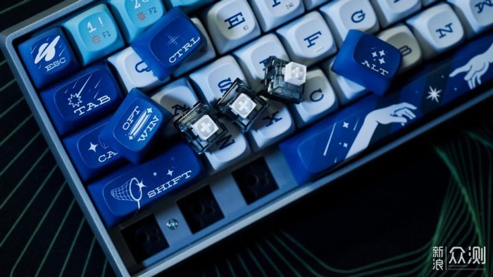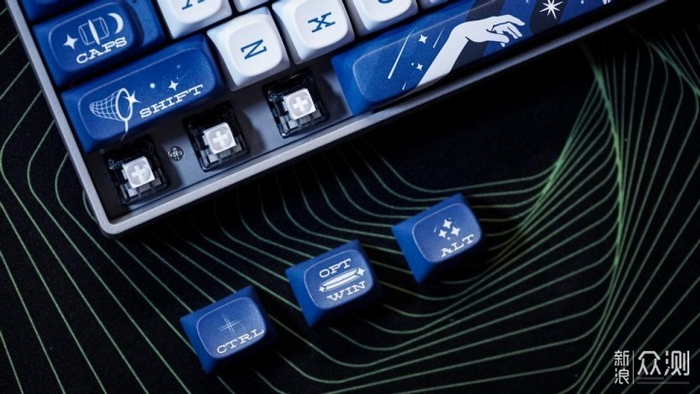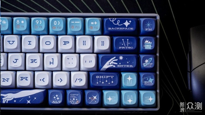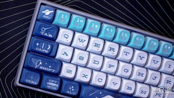 在色彩上,这把键帽是深蓝、浅蓝、淡蓝色三色混色组成。同时搭配了星空元素,整个配色给人的感觉就是辽阔。同时所有的字符都是采用了艺术字体,但是在空格和方向键是没有字符标识的,通过相应的图形可以去判断按键功能。