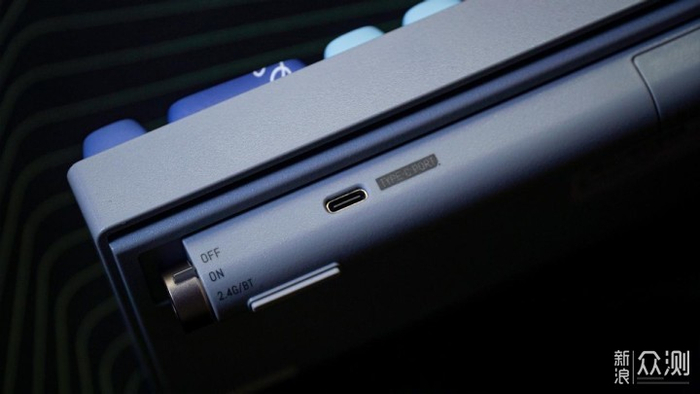 这款键盘的供电方式是锂电池供电,在电池边还内置了了一个2.4G无线适配器的收纳仓,这也可以大大减少适配器丢失的概率。键盘的电源键是在电池仓外侧,通过拨杆来实现开关机和连接方式的切换。键盘的右侧有有些标识,后侧则有展示品牌的logo.键盘整体的颜值很高,设计也很新颖,同时,这把键盘的也很不错,很多细节都做的非常精致。