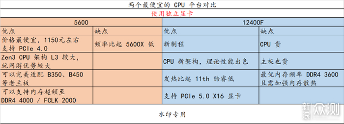 ▲ 如果打算采用独立显卡的话,那么本着强显卡适当削减 CPU 预算的话,5600 跟 12400F 绝对是目前的最优选。两者的优缺点如图所示。虽然 12400F 可以支持 PCIe 5.0 X16 的显卡,但是嘛.......PCIe 5.0 X16 的主板可不便宜,都是1000元起步的。B660 / H610 对于 DDR4 的支持有些小问题,因为 intel 无耻的锁了 SA 电压,导致B660 / H610 如果上 DDR4 3600 的话,就必须对内存加强散热,不然会导致死机。