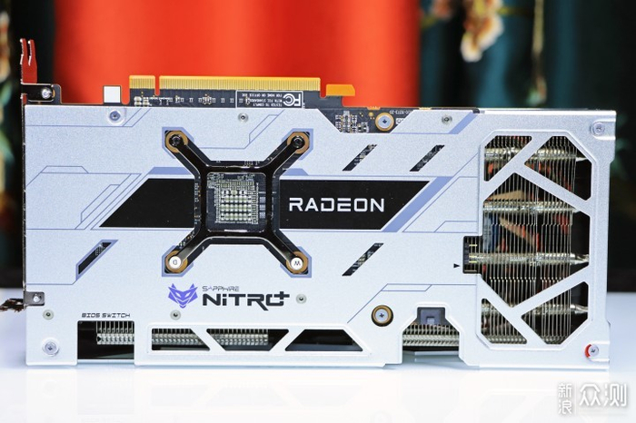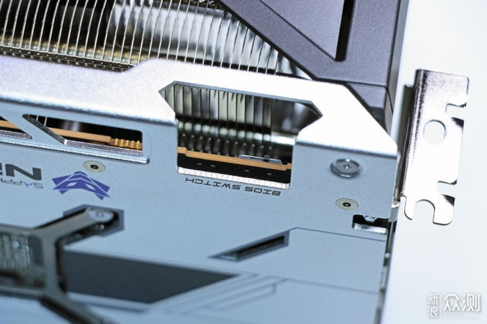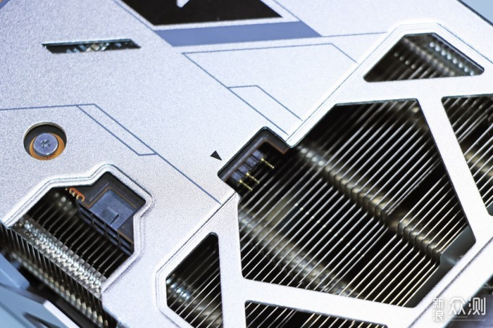 ▲ 顶部视角,可以看到蓝宝石 6650XT 超白金 OC 的厚度为 3 槽,顶部有“RADEON”的 LOGO 与蓝宝的 ARGB logo 灯。风扇导流罩包裹到散热塔体附近,让轴流风扇吹出来的风尽可能用于散热。