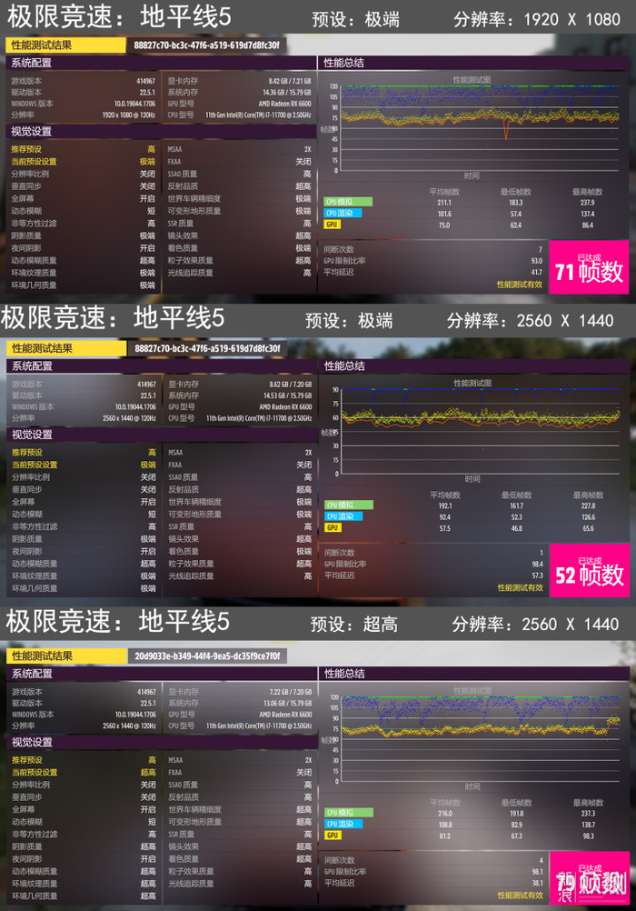 《极限竞速:地平线5》 ,极端(最高)预设下,1080p分辨率可以达到71fps;2k分辨率下降低到52fps,降低一档画质到超高可以提升到79fps,非常流畅。
