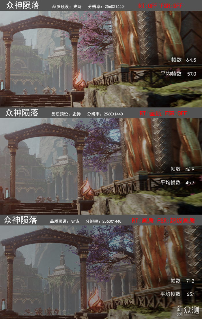 《众神陨落》的bench中,2k分辨率下,史诗(最高)预设,可以达到57fps;开启画质级别的光追特效后,帧数降至46fps,再开启超级画质级别的FSR后,可以达到65fps,流畅游戏完全没问题了!