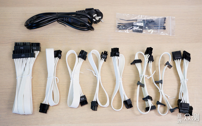 自带的模组线采用白色扁平线,提供1根24pin主供电、2根4+4pin CPU供电(400mm长)、2根(6+2pin) PCI-E显卡供电(400mm长)、2根共计8个SATA供电和1根共4个D型4pin供电接口。