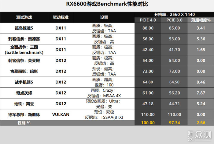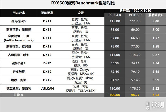 数据直接汇总为表格:1080p分辨率下,以PCIE 4.0的RX6600性能为100%计,PCIE 3.0的RX6600性能为~97%,平均性能的差距只有3%多一点。不过也能看到一些老一点的的游戏差距在5%以上,怀疑是AMD驱动放弃了这些游戏的优化?
